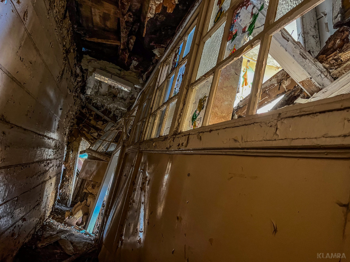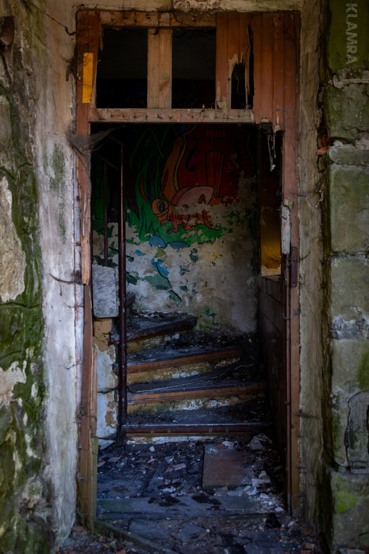 Mimo, że nie zostało zbyt dużo wyposażenia, a dokumentów w zasadzie w ogóle, można natknąć się na fajne artefakty, w postaci malunków na ścianie (lub szybach) Niestety, część najstarsza, drewniana, czyli ta po pożarze, jest zapadła. Czyli pierwsze piętro, obecnie leży na parterze...
