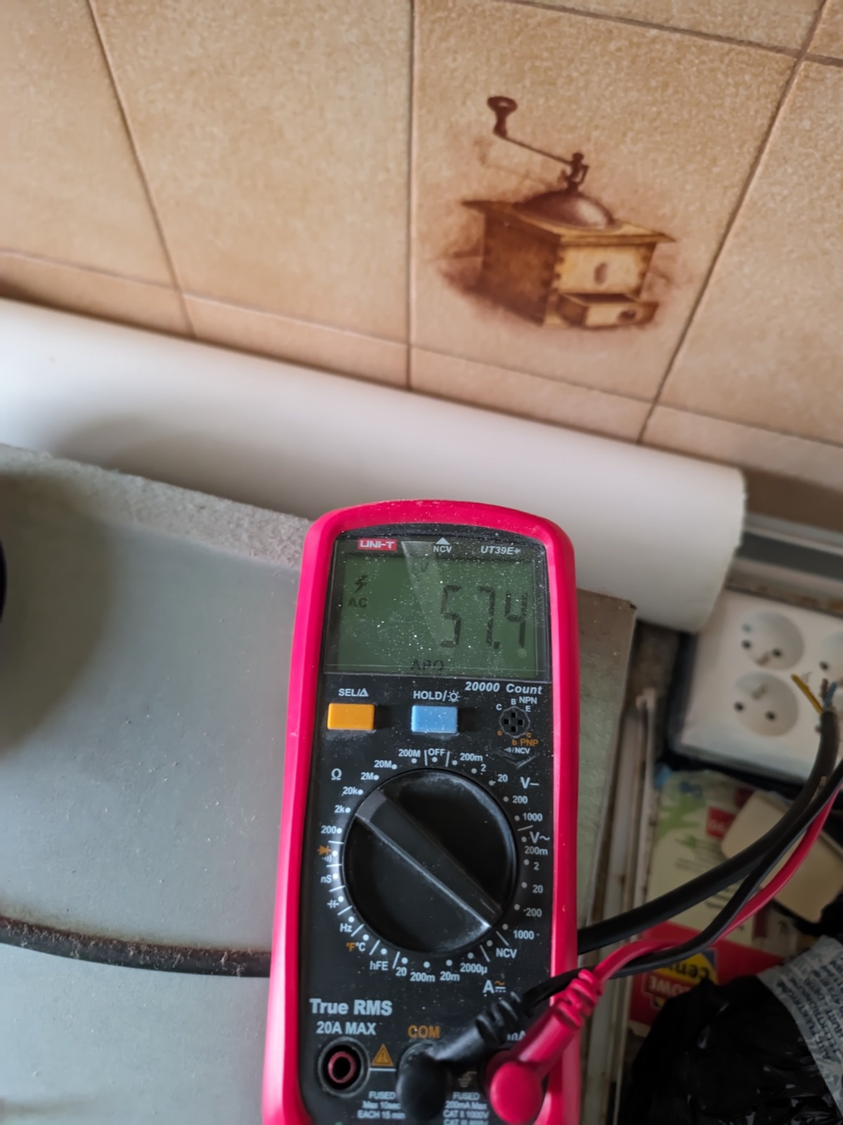No to sprawdzamy. Napięcie w gniazdkach ok. 55 voltów, faza jest. Przy zwarciu kabli nie wywala bezpiecznika. He he he