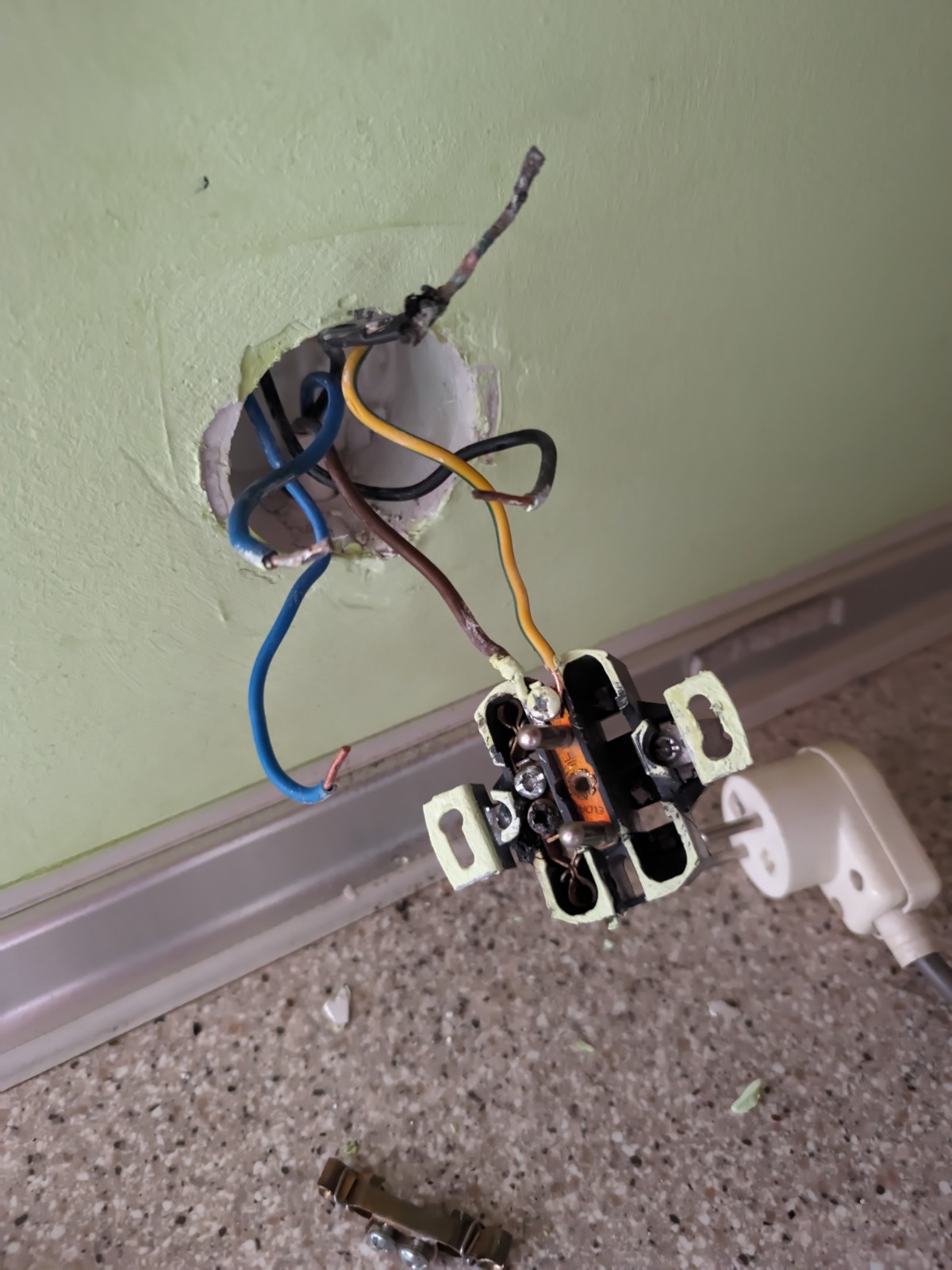 W jednym z gniazdek upalony kabel, taki trochę od czapy. Brązowy przewód przykręcony do uziemienia. Czyżby bezprzewodowe PE w bloku z siecią TN-C?