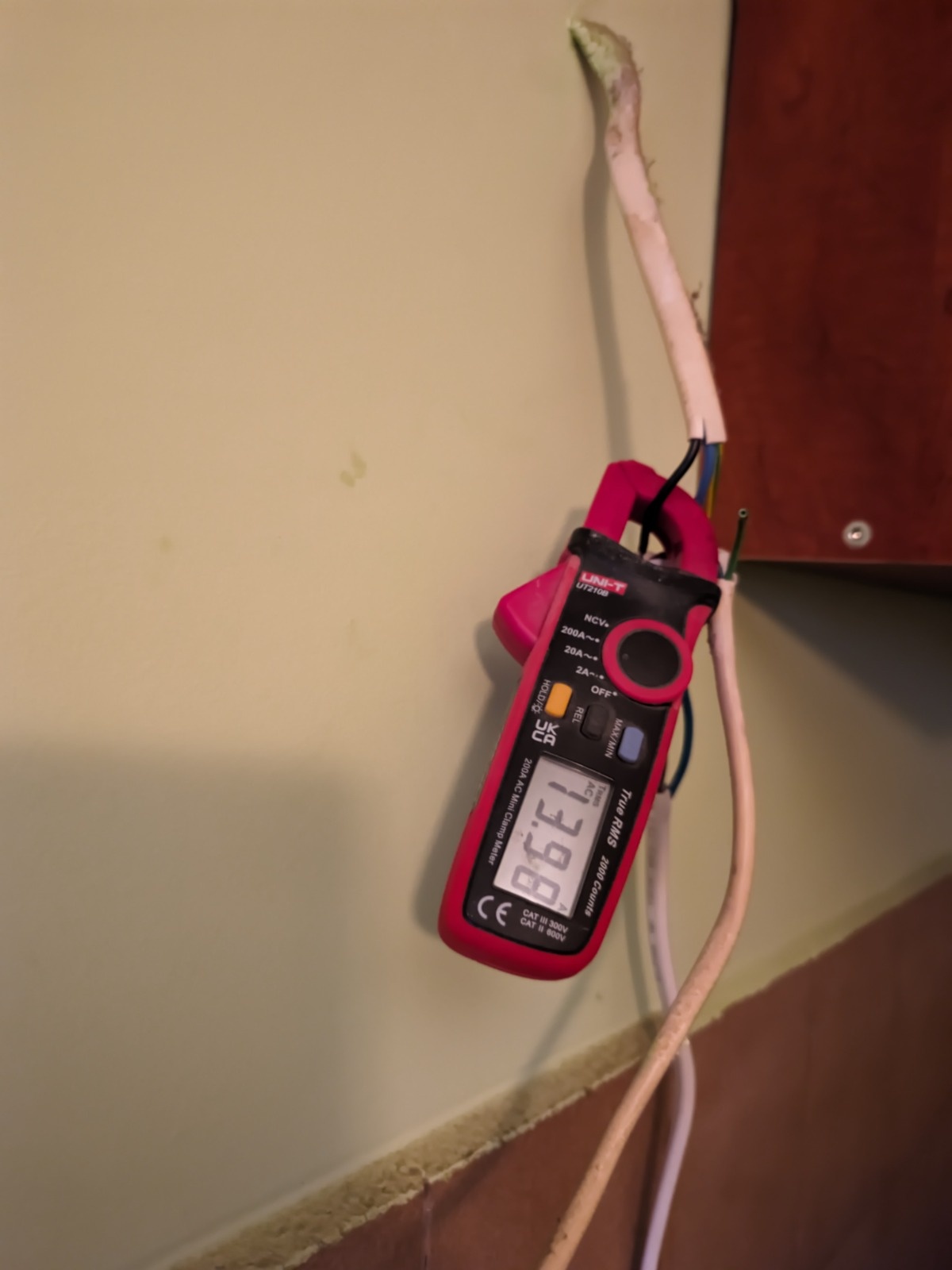 W całej kuchni działa tylko okap. Zdejmujemy szafkę i jest kabel. Nowy, biały, trzy żyły i nawet kolory się zgadzają. Pomiar L-N 245 voltów.