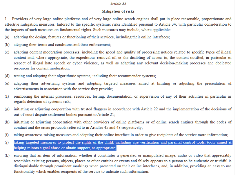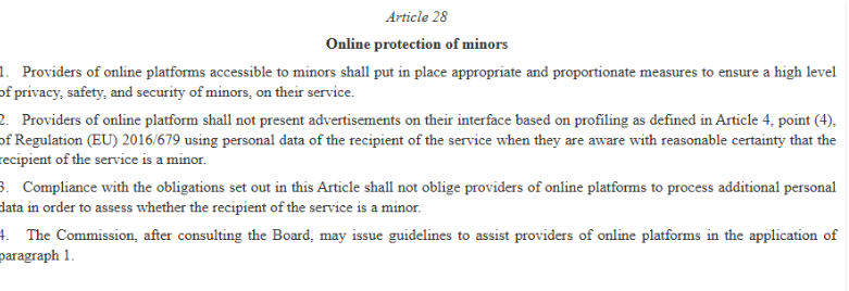 Sprawa dotyczy głównie Digital Services Act unijnego rozporządzenia, które weszło w życie 16 listopada 2022 roku (dostępne w całości pod adresem https://eur-lex.europa.eu/eli/reg/2022/2065 .) W szczególności artykułu 28 (1 i 4)