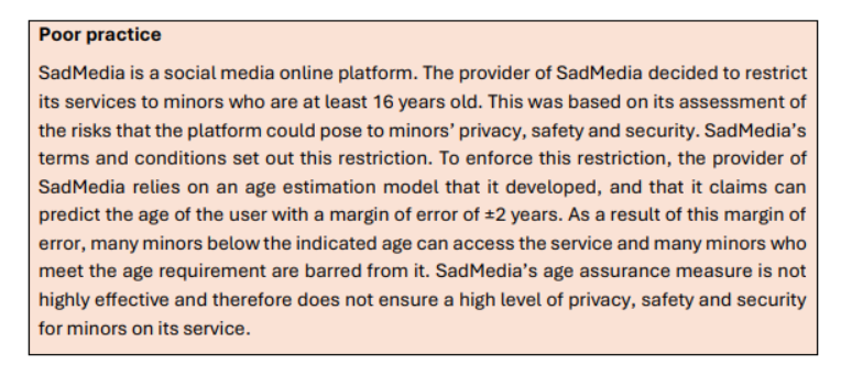 Brak jest tu wyjaśnienia w jaki sposób serwis NiceSpace spełnił wszystkie wymagania odnośnie metody weryfikacji wieku 13 latków. Co prawda sam projekt przedstawia szczegóły tego jak ma wyglądać zapewnianie ochrony dzieci, to jednak nie pokazuje w sposób wystarczający jak ma być sprawdzany wiek w przypadku osób poniżej 13 roku życia.