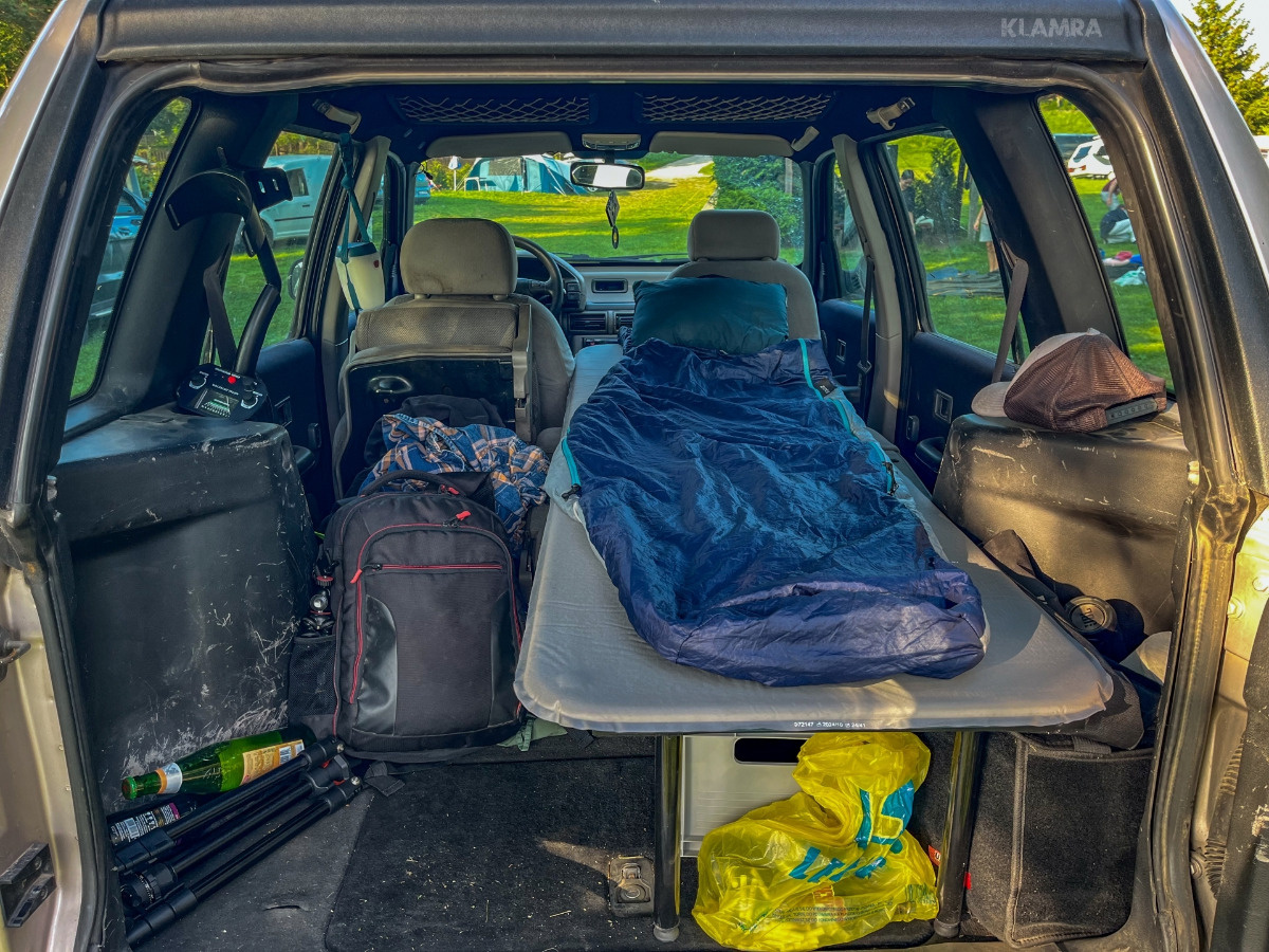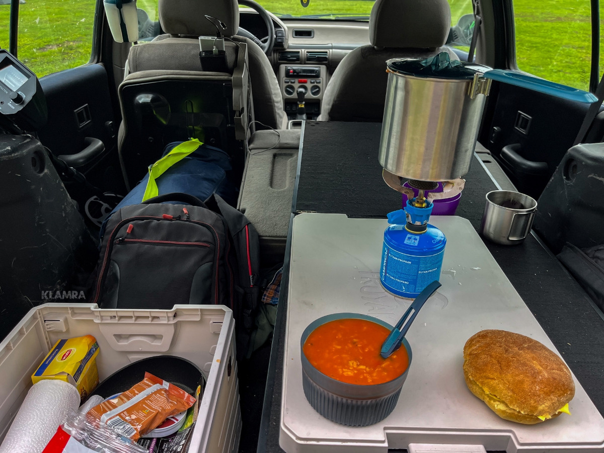Przez większość czasu spałem w samochodzie, gdzie popadnie, lub na jakimś polu biwakowym. Czasami to było na dzikusa, czasami coś opłaconego. Dwa razy wziąłem pokój, żeby się porządnie wykąpać i naładować sprzęt video i powerbanki. Mam co prawda przetwornicę 230V w aucie, ale ona nie nadążała ładować całego sprzętu.