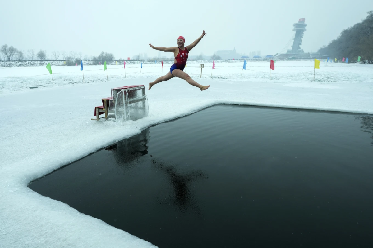 Yu Xiaofeng skacze do basenu wydrążonego w lodzie na zamarzniętej rzece Songhua w Harbinie w Chinach, 7 stycznia 2025 r. (AP Photo/Andy Wong)