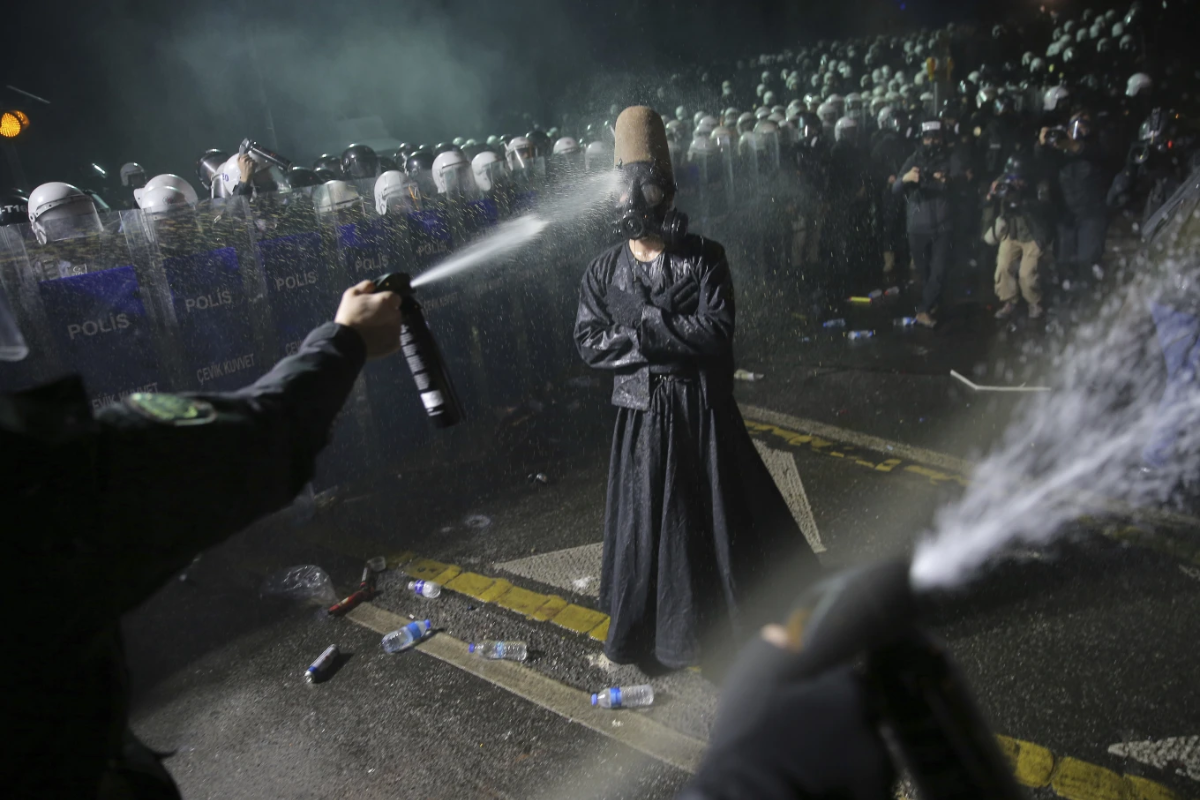 Policja prewencyjna użyła gazu pieprzowego wobec protestującego po aresztowaniu i uwięzieniu burmistrza Stambułu Ekrema Imamoglu w Stambule 23 marca 2025 r. (AP Photo/Huseyin Aldemir)