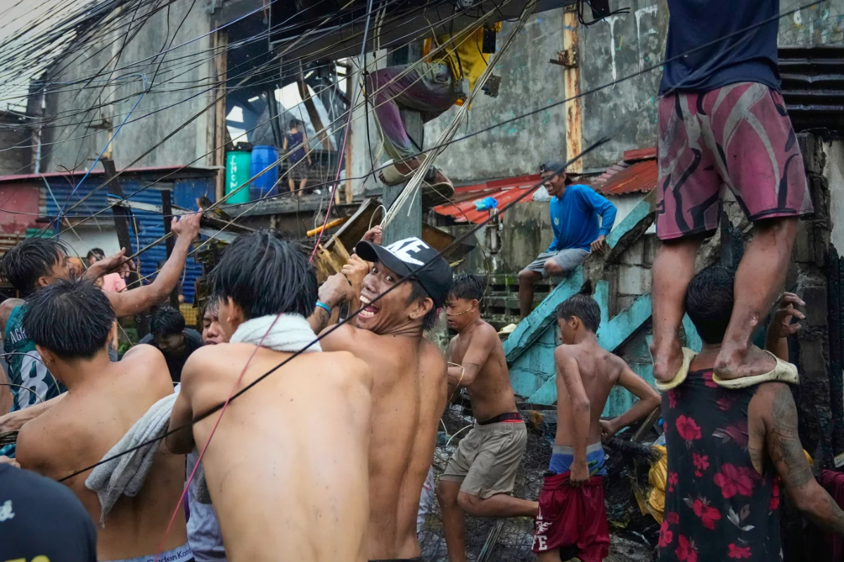 Mieszkańcy ratują przewody elektryczne, które później sprzedadzą, po pożarze, który dotknął biedną społeczność w Manili na Filipinach 6 sierpnia 2025 r. (AP Photo/Aaron Favila)