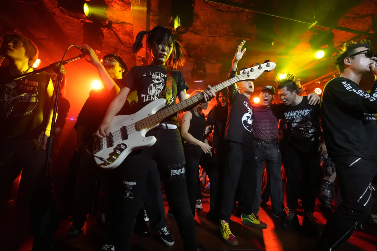 Fani dołączają do chińskiego zespołu punkrockowego Gum Bleed podczas występu na festiwalu muzycznym w Hangzhou w Chinach, 17 stycznia 2025 r. (AP Photo/Aaron Favila)