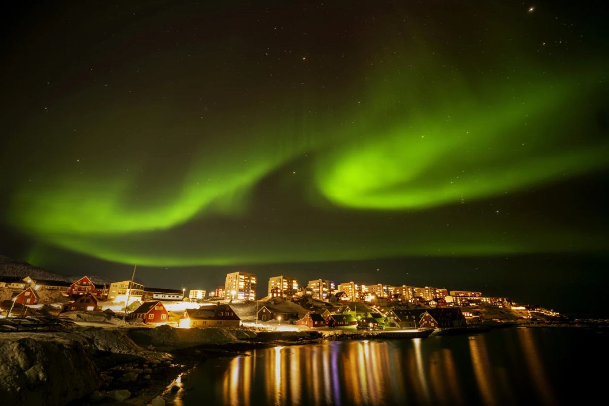 Zorza polarna migocze nad domami w Nuuk na Grenlandii, 17 lutego 2025 r. (AP Photo/Emilio Morenatti)