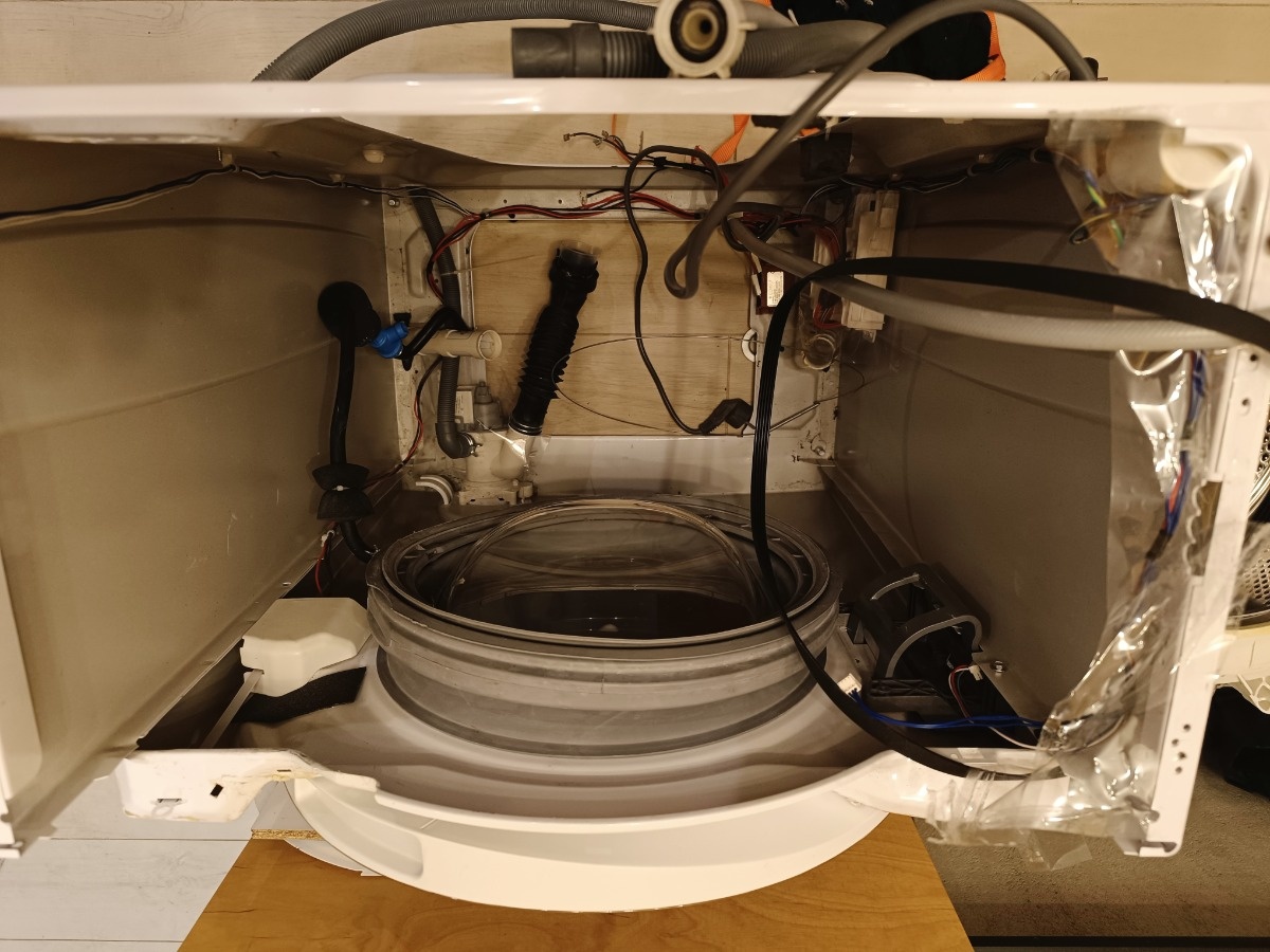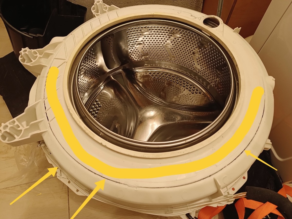 Kilka dni temu pojawił się wyciek wody od spodu więc pralka wyjechała z szafy i po zdjęciu tylnej pokrywy zauważyłem wyciek z zespołu piorącego. Pierwsze podejrzenie padło na uszczelkę pomiędzy dwiema polowkami skorupy bębna.