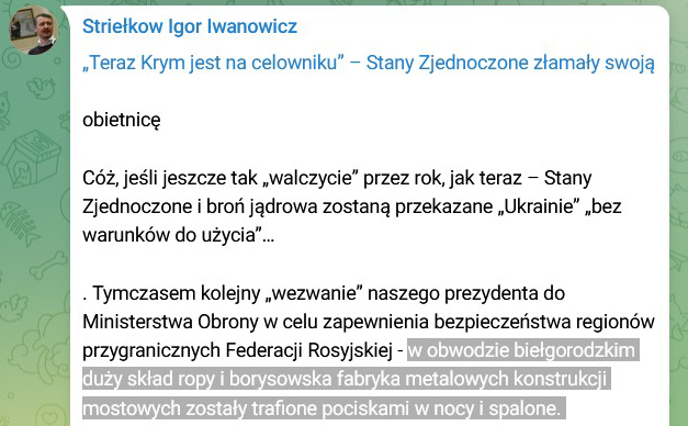 Tak, słyszę cię, dzień dobry. Kwaczkow, nie teraz blyat, na żywo idzie, zapnij rozporek. Tak, już wyjaśniam, w obwodzie biełgorodzkim duży skład ropy i borysowska fabryka metalowych konstrukcji mostowych zostały trafione pociskami w nocy i spalone.