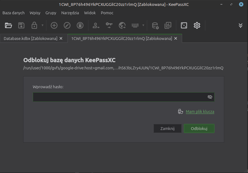 Chatgpt podpowiedział, że linux jakoś inaczej widzi pliki na google-drive bo to jakiś inny system plików i pod „czystym” linuxem nazwy będą widoczne poprawnie. Jednak w innych aplikacjach, w tym keepass mogą być widoczne w jakimś innym trybie co objawia się nazwami jak na załączonym obrazku. Piszę to z pamięci, ale mniej więcej tak to brzmiało. Mogę sobie doinstalować jakiś dodatek o nazwie fusermount i nazwy plików będą czytane „normalnie”. Aha?!. Za łatwo szło, a już się witałem z gąską…