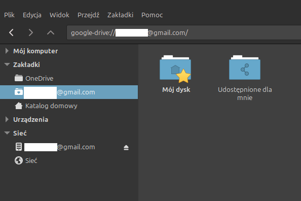 Finalnie w linuxowym eksploratorze plików (czy jak to się to tam nazywa) zobaczymy nasz google-drive tak jak na screenie poniżej.